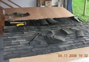 The typical shingles you see on roofs are installed using tar paper, which helps ensure that water will not leak in. Also standard shingles are usually doubled up on the first row to help keep water out. The shingles were a bit thick (1/4")so I was not able to double up, but I did find that the rubber is very tight against the nail and helps to seal the holes much more so than traditional shingles. In Images 9 and 10 you will see a plastic bag that I stapled down for a little extra protection and the process of installing the shingles. The owners did have some roofing nails but I ran out and had to buy a box to finish the project. I took about 14 hours of labor to nail all of the shingles in and it only took four hours to make them all.