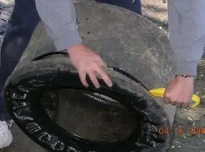 As with any project there are always mistakes, or learning curves as some might say. So here is where I tell you about what didn’t work (for me). The initial tire concept was based on utilizing radial tires and that changed very quickly. The first tire I tried to cut was, to say the least, very smelly. I tried using a cutting wheel on the end of a drill (spinning at about 30,000RPM) and I found that while it would cut through the bead of the tire and all of the steel belts it wouldn’t cut the rubber, it just melted it. After breathing a cloud of burning rubber and trying it again wearing a breathing mask, I decided that it may not be the most "appropriate" method. That particular method took about an hour and a half with only 8 small shingles being produced. The next method I tried was a jigsaw; it didn’t even cut through the rubber. The tire was too flimsy and would shake, so the jigsaw couldn’t cut it if the tire didn’t stay still. I didn't even get one shingle out of that attempt. The last method I used on the radial tires was a hack saw and let’s just say that it would have taken more than a year to cut the shingles that I needed. I then learned that there is only one part of a radial tire that doesn't have steel belts and that is the side wall between the tread and bead. I did try to use a utility blade (box cutter) and cut just the side wall but it was harder to cut curves and keep them some what straight edged.