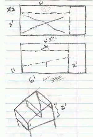 As mentioned earlier during the Clients/Site portion, I ended with "little did I know . . .". Well, I didn't think ahead with the weight factor. The run that was already built for the coop was way too flimsy to support these shingles. The shingles averaged 14 lb per 25 shingles and I had 460. Since covering the run was out, the owners and I needed to think of what we could do instead. They had a big enough garden and the chickens already had access to it so we decided to build a semi-portable roof and place it in the garden area. To the right is the sketch for the new roof and it required (2) 8' 2"x4" and (3) 4'x8' Plywood sheets.