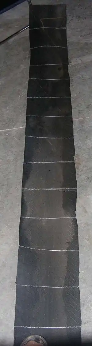 After several failed attempts with radial tires, I spoke with a local tire dealer and found that Racing tires only have Steel belts in the side walls, not in the tread. He happened to have an old tire so I took it home to see what I could do. I drilled a hole in the tread and used a key hole saw to start cutting. It went rather smoothly but it did take two people and still took about 45 minutes to make 12 – 14 shingles. I knew these were the type of tires I needed but I needed a lot of them, it turns out the the guy at the local tire dealer knew someone who had a ton of old Racing tires. Before I went to the store to buy brand new hole saws, I tried a utility blade (box cutter) (just for laughs actually) and found that it cut through the tire like a hot knife through butter (Image 1). This method cut the time down to minutes. After cutting the side walls off, I had a round thin circle of rubber(Image 2). Then cut it so it was a long flat sheet about 8" x 80" (Image 3).