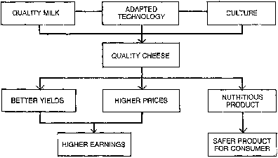 If rural cheese factories are organized as co-operatives or associations then the entire community will benefit. As members of a co-operative, dairy farmers who send their milk to the plant will have a stake in its development and future success. With a higher income, farmers can improve their herds, pastures, and dairy practices, and high quality cheese and butter will contribute towards a healthier national diet. But whatever structure the rural cheese factory adopts whether as a co-operative or as a private concern there is a 'knock on' effect which will be to everyone's advantage (see Figure 1).