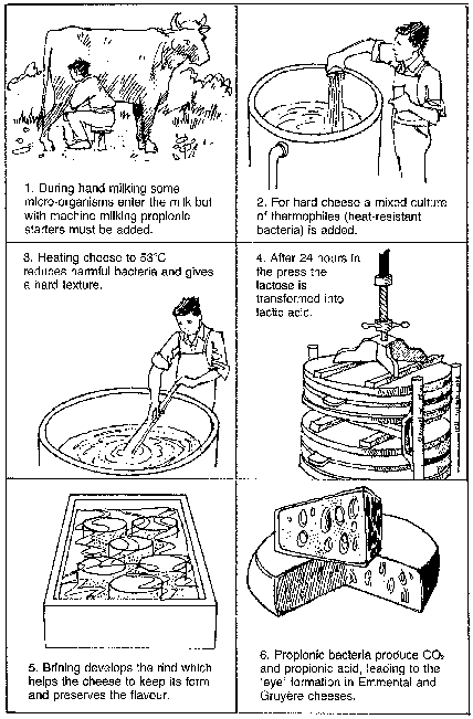 Each kind of bacteria also has a minimum and maximum temperature within which it can live and multiply, and below or above which it cannot grow. Between 5 C and 10 C, lactic acid-producing bacteria slow down their reproduction rate considerably and so reduce the conversion rate of lactose into lactic acid. Propionic bacteria develop at temperatures over 18 C when they consume lactic acid, producing CO2 and propionic acid, leading to the sweetish flavour and 'eye' formation in Emmental and Gruyere cheeses. When the eyes are well developed the fermentation can be stopped by lowering the store room temperature. Milk stored below 5 does not sour quickly and therefore keeps much longer than warm milk; below 0 C bacteria remain dormant, although they do not die. In addition to specific temperatures for pasteurization, temperature control at each stage of the cheesemaking process is vital (see Table).