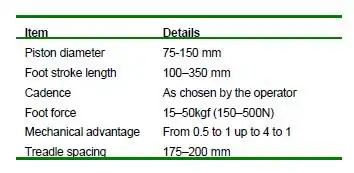 Figure 8 below, taken from Kay, 2000[40], identifies most of the desirable characteristics for a treadle pump. Since the operator’s position on the treadles can vary, this is not explicitly defined in the table. Other desirable characteristics can include weight, or lack thereof: a heavy base and frame can be left alone as they are more difficult to steal, while a wooden or bamboo frame are light and portable, so can be used in several areas of one farmer’s field, or can be shared by neighbouring farmers to irrigate the collective land.