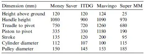 Figure 9 below shows the main dimensions of four treadle pumps currently in use in Zimbabwe.