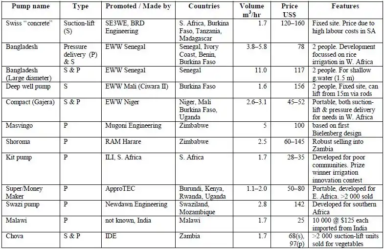 As well, the Development Technology Unit from the Department of Engineering at the University of Westwick in England put out a paper detailing the constructions methods used as well as performance characteristics for the Bellow Pump (not a true treadle pump), the Tapak-Tapak or Bangladesh Pump, the USAID Treadlepump (Ivory Coast), the Harare Treadlepump (Zimbabwe) and the Warwick Treadlepump (Nigeria).