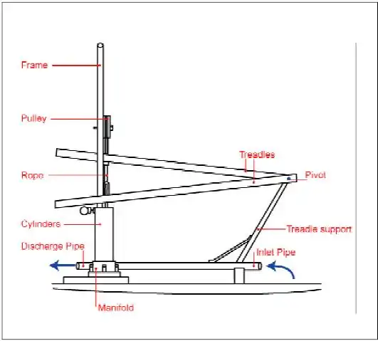 Treadles need to be strong enough to take the forces applied by the operator, and stiff enough to transfer the applied forces to the pistons without undergoing significant bending. Depending on the lever class being used, the treadles can be hinged at one end or in the middle, with the opposite end being supported by a rope and pulley or rocking bar. The range of movement is dictated by the stroke length of the pistons and by the comfortable working step of the operator. Treadles are generally made from wood, bamboo or steel. Steel is the stiffest and most expensive of these materials; however, the mechanical advantage can be greatest when using steel treadles. There is a practical upper limit to this advantage, as the pump may overturn if the operator stands at the extreme end of the treadles and there isn’t enough weight in the frame [35].