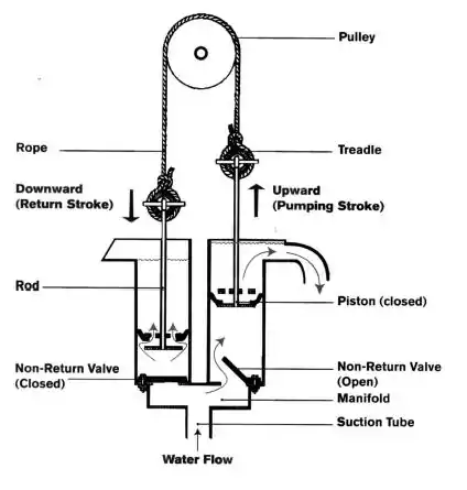 It has been mentioned previously that suction pumps have two non-return valves and pressure pumps have three. The valves allow water to flow in one direction only, by opening and closing due to the positive and negative pressures developed during pumping. It is possible for another valve to be fitted at the entrance to the inlet pipe, which would avoid the need to re-prime the pump every time it is used [33], as well as preventing large pieces of dirt from getting sucked into the pump system. Various types of non-return valves are used, including rubber flaps, swinging gates and poppet valves [34].