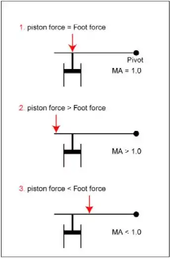 Mechanical advantage has a direct impact on the stroke length of the piston: an MA greater than 1 means a decrease in stroke length while an MA less than 1 results in an increase in stroke length. Taking advantage of MA’s greater than 1 allows more force to be applied to the piston, hence greater pumping pressures can be achieved, but this is at the expense of volumetric flow because of the reduced piston stroke length [23].