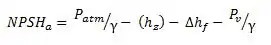 P_atm= atmospheric (or absolute) pressure; γ= specific weight of the fluid; h_z= vertical distance (elevation) between the surface of the water and the pump; ∆h_f= head loss due to major and minor losses in the suction pipe, valves and fittings; P_v= vapour pressure of the fluid; and