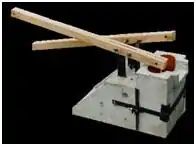 The rope and pulley wheel enable the reciprocal movement of the treadles. The wheel has a central axle mounted to a frame; a simple axle, such as a 16 mm diameter bolt, is normally used [36]. It is usually made of wood soaked in oil to preserve it and to lubricate the movement [37]. The alternative to the rope and pulley method is the rocking bar. This arrangement is harder to balance but may be easier to construct in some cases [38].