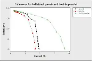 recording data for each individual panel and both panels wired in parallel, Minitab software was used to create a graph of the current-voltage curve.