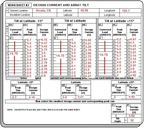 It is important to remember that magnetic south is not the same as true south. A compass aligns with the earth’s magnetic field, which is not necessarily aligned with the earth’s rotational axis. This magnetic declination from true south is known as the azimuth, and varies depending on specific location. The optimal tilt occurs when the panels are oriented perpendicular to the suns rays. The highest average insolation will fall on a panel with a tilt angle equal to the latitude of that specific area. (Arcata has a latitude and longitude of 40.98 by 124.1.) By using the chart below, the best orientation the panels is determined to be about 17 degrees east of magnetic south, with a 41 degree tilt. (year round loads should have a tilt angle equal to the latitude of that location.)
