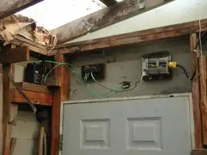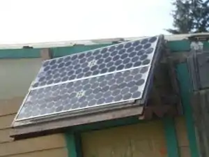 - Now that a new panel was part of the system, it was necessary to find a way to secure it to the building. The only reasonable way to connect it to the other panel in parallel without long unnecessary wiring was to integrate it into the preexisting mounting structure for the PV system. This was accomplished by using lumber found on site at the AEF to extend the beams from the house and secure it to the upper part of the building. Some metal bracing also found on site was used to reinforce the structure to the frame of