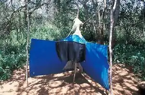 •Fit the polythene cage at the apex of the erected trap and support the cage with strings stretched from thin sticks that are fastened on one of the side poles.