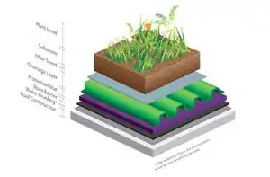 Underneath the plants and soil, green roofs need a filter, drainage layer, and a root barrier and waterproofing (which can be combined) by using a pond-liner. [2]