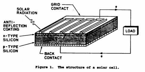 The processes work this way: The energy of the incoming sunlight causes electrons to cross the barrier and remain trapped on the front, or negative, side. When contacts are made to the front and back sides of the solar cell, a current flows through wires and devices connecting these contacts. The current is proportional to the intensity of the sunlight that falls on the cell. The back, or positive, electrical contact can be a continuous layer of metal, but the front contact is made in the form of thin fingers, to allow as much sunlight as possible to reach the back layers. The cell is usually covered by an anti-reflection coating and a protective cover to allow cleaning. A more detailed explanation of how photovoltaic cells work is given in references 8 and 9. The structure of a solar cell is shown in Figure 1.