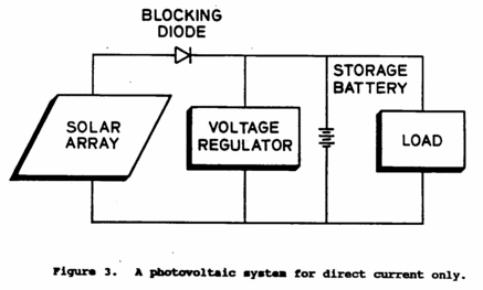 A solar-cell array with battery provides direct current (d.c.), which has many uses. A photovoltaic system for d.c. only is shown in Figure 3. For a simple arrangement of a few lights and a radio