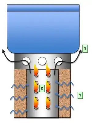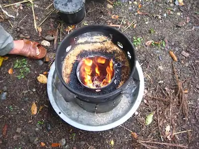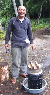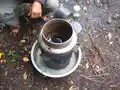 This rice cooker can only be used out-doors. It is similar in action to the sawdust stove, but unlike the sawdust stove the rice-hulls do not require compaction and it is intended specifically for rice cooking, although probably it can be used to cook other things.
