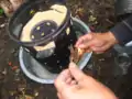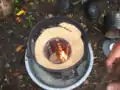 Fig 3e: Once the rice hulls start burning and smoldering slowly, a pot containing the water and rice can be placed over it.