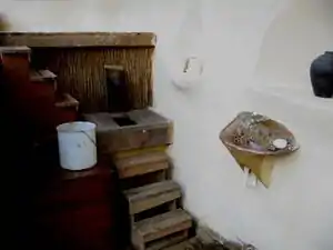 The funnel (center left, at front of opening slot, look for the black drain hole) is hand-shaped cement mortar over expanded metal lath, placed to catch urine flow from sitting persons of either gender (men can use it standing as well, although it's less messy to just go outside). I fit black plastic pipe into the lath funnel, and plugged the opening with a wad of paper while I worked the cement. The original funnel extended a bit too far back, so I cut it down with a masonry saw and hammer and chisels. A plastic bottle with the bottom cut out also works, especially for determining optimum placement