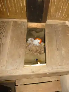 The seating is 2-by-6 cedar planking (below, far left), since moisture and condensation do form on the inside. The 5-1/2" slot (made by hinging the central plank) makes a nicely sized and comfortable hole and seat. All the planking is fitted, w/angular cuts. For ease of removal, side planks aren't fixed; this makes for more convenient access when necessary. The wall behind the seat is vertical, woven willow wattle, plastered from behind and smoothed in front to expose the wattle. It is still awaiting final cleaning and lime wash.