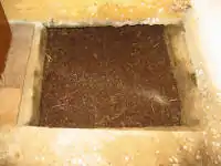 The compost at the bottom of the working chamber (right) is looking nearly done. At this stage, I sometimes find worms wandering at the edges of their home -- looking for more food, I presume. But populations adapt quickly. They typically work throughout the pile (paper and kitchen wastes too), making for speedy composting. They like moisture. A dry pile isn't normally a problem, though it did happen this past fall. We just added a little water every few days, and the worms quickly came back up to speed. This chamber is accessed by removing the steps above which normally cover it.