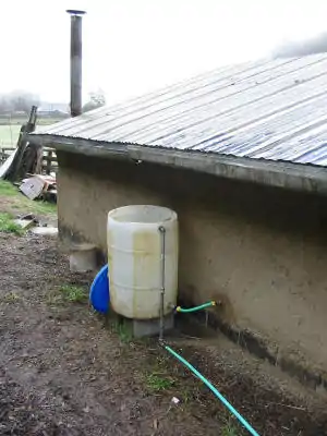 The barn's interior is finished with a lime wash, pigmented with our local ochre. Earthen floor is rough coat only -- awaiting summer to put down the smooth finish coat. The toilet box is cast concrete, extending below ground in an 'el' that reaches forward, toward the viewer. On top of the leg of the 'el' is a trapdoor for emptying each of two chambers, which are divided vertically. While deposits are being made in one, the worms are finishing off the other. The hand washing sink water supply is an exterior rain barrel (see below); the sink drains into the toilet, where it flushes the urine funnel, diluting the urine so it can be applied directly to garden beds as fertilizer, added to working compost piles, or sprinkled on the lawn. Odors are only as objectionable as our attitudes make them, and in any case, easily contained and quickly dissipated.