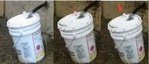 Pee drains into a 5 gallon bucket outside (pictured below). The bucket is rigged with a flag on a foam cork that fits (loosely) inside a piece of plastic pipe fitted into the lid -- this mechanism provides a simple indicator for when the bucket needs emptying. As urine generates ammonia and a very basic (as opposed to acidic) environment it is necessary to separate it from the other wastes to prevent toxicity to the worms.