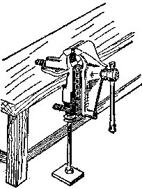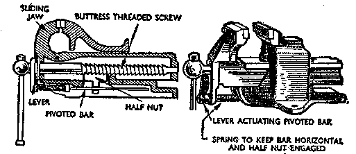 Mounting a Vise. In attaching a vise to a bench, it should first be fitted so that it sits level; then it is bolted through the bench. The vise should be about 3 to 4 feet from the ground. A more accurate method of positioning is ensured by making the top of the vise equal in height to that of the worker's elbow from the floor when the arm is bent. This was explained in the section on Filing. In any event, it is better to have the vise a little too high than too low, as it is always possible to build a platform to bring the worker up to the best working position. Quick-Release Arrangements. Parallel vises are frequently designed to have an instantaneous grip. This means that the jaw can be moved in or out quickly by pressing a small lever and pulling or pushing the sliding jaw to the required position. The ordinary screw arrangement is then used to give the grip (see Fig. 4).