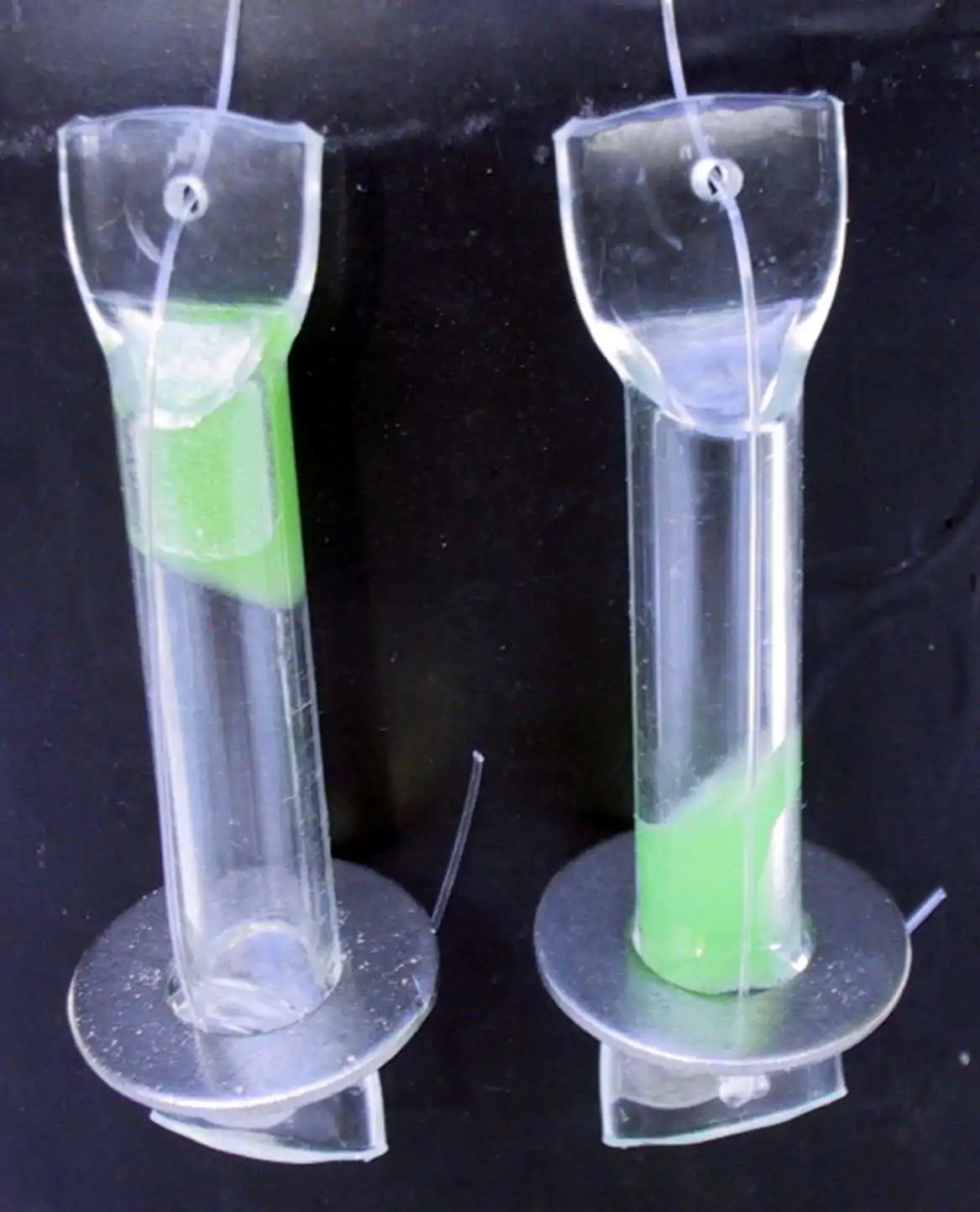 The hydrogenated soybean oil called Myverol 18-06 K (a food-grade emulsifier powdered wax) is encased in a small clear plastic tube, weighted with a metal washer. Fishing line or wire suspends the WAPI toward the bottom of the water container (where the water is coolest). The WAPI is oriented with the wax plug at its top, but after melting the wax flows to the bottom part. Then the user can remove the WAPI by the string or wire without contaminating the clean water with the fingers.