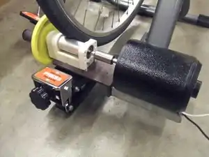 The factory-made resistance roller was modified so that it would roll with the DC motor shaft. The resistance used for training was removed and replaced with the generator. The generator shaft is coupled with the roller shaft, so when the roller is spun by the bike tire, the generator shaft is also rotated.
