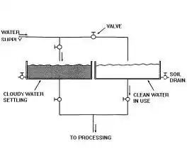 Suspended soils can be removed by allowing them to settle out in settling tanks, see Figure 1 and/or filtering the water through specially designed water filters, see Figure 2. Both processes are relatively slow and large storage tanks are necessary if water is needed for washing or incorporation into the product. Water for cooling can be re-circulated. Although some types of water filters also remove microorganisms, the easiest way of destroying them is to add chlorine solution (5-8ppm final concentration of chlorine obtained by diluting bleach to 0.02-0.04%). Lower chlorine levels (eg 0.5ppm) are needed if the water is to be used in a product to prevent 'off' flavours. Chlorination of water supplies can be simply arranged by allowing bleach to drip, at a fixed rate, into storage tanks or pipelines. The rate of bleach addition is found by experiment, using simple chlorine paper or more sophisticated probes to check the chlorine concentration. A less suitable alternative is to boil water to sterilise it. Water should be heated to boiling and then boiled vigorously for at least 10 minutes. This of course has a high fuel requirement and will therefore increase processing costs.