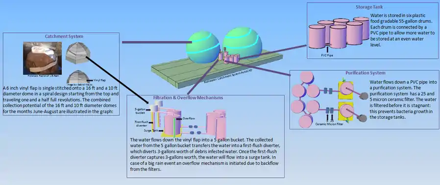 A standard rainwater catchment system is usually built off of a square roof with the use of attached rain gutters. For the WetLand Project, the Replenish Life Team is required to design a rainwater catchment system off of a geodesic dome by using billboard vinyl as the main material.