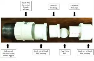 2. Start on the right side, relative to the image. 3. Make sure to use Teflon tape for both sides of the PVC nipple, and the male side of the PVC adapter. 4. Apply the primer and solvent to the slip in connection pieces. 5. Start by applying the primer to the socket of the threaded male PVC adapter and the tip of the PVC pipe. 6. Apply the solvent about 80% to 90% in the socket. Also apply the solvent to the attachments. 7. Connect the slip in connections that have the primer and glue by applying a perpendicular force. Make sure to apply a small twist while connecting the elbow and the PVC pipe. 8. Do not Glue Slip Cap, but use PVC glue to secure all the attachments. Keep in mind the ball will be floating inside the 1-1/2inch PVC pipe 10inches long, so the 10inch long PVC pipe needs to be glued to the 1inch PVC bushing that has cut off the beveled end and grounded edge. |