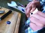1. Grab uncut vinyl billboard material 2. Cut 2inch in height and 2inch in length to form a rectangle. Make 15 rectangles. 3. Grab a rectangle, measure the 1inch side with a ruler and mark with a sharpie a 1inch fold line. 4. Fold the rectangle and create seamed edge like vinyl flap. 5. Insert grommets in the center of the rectangle. Proceed on all 15 rectangles. | ||||||||||||||||