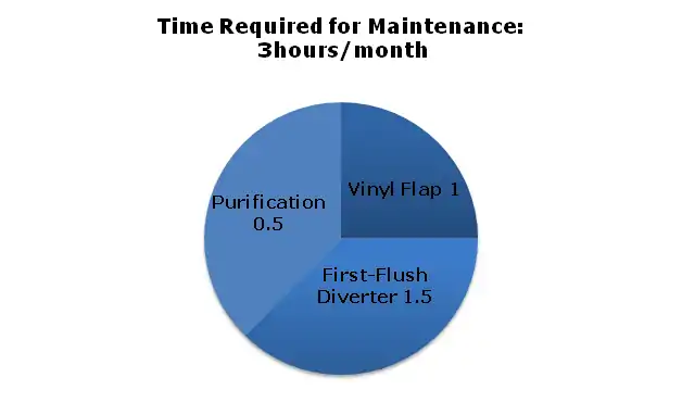 To clean the first flush divert the residence will be required to spend a total of one hour and thirty minutes. Cleaning the first flush diverter will require the residence to rinse the 5-gallon bucket attached to the first flush and add Plummer’s Grease every time the first flush diverter get remove.