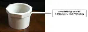2. Draw a line on the outside of the PVC bushing where the beveled end is located, as shown in the image. 3. Cut the beveled piece off with a Hack saw. 4. Ground the edge off the PVC bushing by using a deburring cone for PVC. |