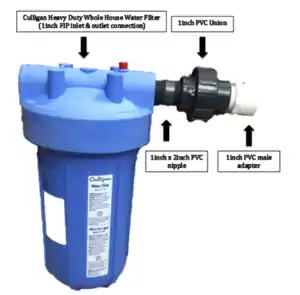 2. Grab the PVC nipple and Teflon tape. 3. Tightly coat both sides of the 1inchX2inch PVC nipple with Teflon tape. 4. Apply Plummer's Grease to the PVC nipple and to all threaded pieces of PVC. 5. Insert the PVC nipple into the water filter. 6. Insert the other end of the PVC nipple into the 1inch PVC union. 7. Coat the threaded male PVC adapter with Teflon tape and add Plummer's Grease. 8. Insert the 1inch male threaded PVC adapter to the other end of the PVC union. 8. Apply the primer to the socket of the 1inch threaded male adapter, and to the 1inch PVC tip. 9. Apply the solvent to the Socket of the 1inch threaded male adapter, and to the 1inch PVC tip. Follow all procedures in step 3 to connect the Purifiers to the storage tank and the surge tank. |