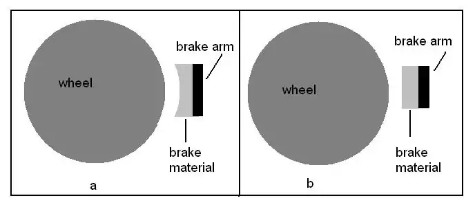 The material used to inhibit motion of the wheel, that is the brake material, must have a high coefficient of friction when in contact with the wheel, be resistant to wear and environmental effects. [10] Rubber, old tires, brake pads from old cars or bicycles or a dense, rough plastic material are all appropriate materials for this application. When attaching the material to the arm, a point to consider is the shape of the material. Figure 6 below shows two options with diagram a showing the more preferable shape.