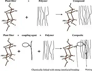 A second limitation in the compounding process is the lack of dispersion between the wood fibers and the thermoplastic matrix. To improve this limitation, a coupling should be introduced in the mixing process to help facilitate the bonding between the wood and thermoplastic. The introduction of a coupling agent, seen in Figure 6, can have a large impact on the tensile strength of a WPC. An experiment, done by Andrea Wechslera and Salim Hiziroglu, showed that when a coupling agent was added in the compounding process the tensile strength of the final product could increase from 2109MPa to 3560MPa, or by 68%. [12]