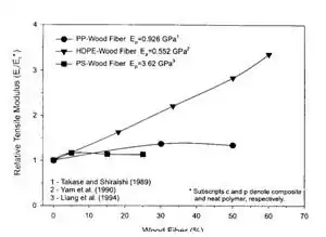 The first step in wood-plastic composite fabrication, called compounding, blends organic plant fibers with an inorganic thermoplastic. The percent of wood fiber used in this processing step is very important as it directly affects the tensile strength and Young’s modulus of the product produced. Graph 1 and Graph 2 show how the relative tensile strength and relative tensile modulus of the WPC produced changes when the amount of wood fiber is varied, respectively.