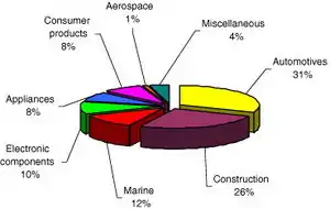 Typically, fiber reinforced polymeric composites have been used for a variety of structural applications because of their high specific strength and modulus compared to metals.[3] Current applications of WPCs, shown in Figure 8, lay in the automotive, construction, marine, electronic and aerospace industries.