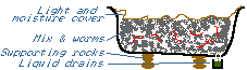 This is a much larger scale system, place an old bath on some rocks or bricks, high enough to get a bucket underneath the plug-hole. Make sure that it drains towards the plug. Fill it with either a mix of 2/3 manure, and 1/3 scraps or prunings or just processed compost. Make sure the manure doesn't come from animals treated recently for worms. If you shred the scraps then the process will be quicker. Put in at least 1000 worms. Cover with a lightproof cover, that will let the rain through. For example scrap carpet (fluffy side down) or hessian.