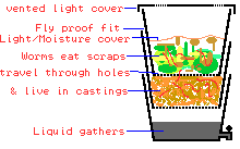 Construction: In this system, a set of three or four stacked bins are used. Ideally, they need to fit together tight enough that larger flys can't get in, but slide enough that the top bin rests on top of the castings in the tray beneath it, this is important because the worms live in the castings of the second tray from the top, migrating up to the food scraps to eat. Some ideas for bins to try might be large plant-pots, or yoghurt pots, or some kind of stacking storage system. We haven't tried any of these, so we'd love to hear reports. The other alternative is to buy a set of trays designed for this, for example in Australia, Reln plastics make a couple of designs from recycled plastic that works well. Start it off by mixing compost and scraps in the top tray, and adding 1000 worms. Cover with something that will keep the light out, and the moisture in, for example wet newspaper, hesian or upside-down carpet.