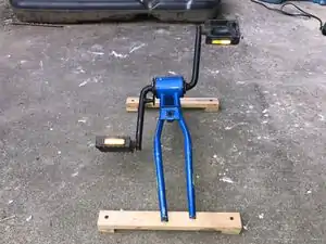 Prototyping for function - The second pedal prototype was created using a $3 craigslist bike. We cut more strategically this time. This gave us a much stronger frame to work with. Then we took apart the bike to get down to the bearings. We packed them full of grease to allow for a smoother and quieter ride. We used copper brackets to secure the front part of the pedals to the 2x4, and we cut small grooves into a strip of cedar that was used as the back support.