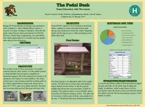 The purpose of this Spring 2019 ENGR 215 project is to build a desk with an attached pedal system for our client, Zane Middle School. Since middle school students have tons of energy and sit in a classroom most of the day, pedaling while working on assignments allows them to quietly get their jitters out will getting work done. Our client representative, middle school teacher Paige Boone, had this problem and gave us the task to build a desk with pedal system to help improve her student's ability to work in the classroom.