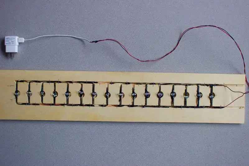 The LED light structure has components of wires, resistors, LED lights, heat shrinks, USB port charger, and wood. 5mm diameter LED lights are used and wired together in parallel. The lights are in series with 150-ohm resistors. The voltage drop across each light and resistor is 2.85 Volts and current of 19 mA. To avoid fire hazards, heat shrink is placed around all of the wires. The circuit is then attached to a wooden board to hold it in place. This board can easily be attached to the inside of the base of the pendulum. The wooden board with circuit is pushed through the predrilled holes in the base and nailed for permanent placement.