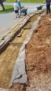 In order to build our pathway, we need to clear the ground of mulch and debris, dig roughly four inches down and level the ground we're paving. Once the area is cleared, we will set the bender board lining with stakes and wooden planks spaced every six feet for roughly 60 feet.