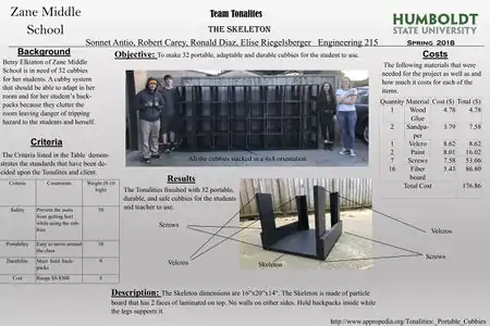 The objective of Team Tonalites was to construct a set of cubbies for a Catherine L. Zane Middle School teacher to help promote safety in the classroom by creating space for students to place their belongings. The most important part of building the cubbies is making sure they are safe. Each cubby has to be portable to extend the capability of their usage. There are a total of 32 cubbies built. They are made out of medium density fiber board and held together with screws and wood glue. Their light structure makes for easy portability and versatility in the orientation of which they will be placed in the classroom.