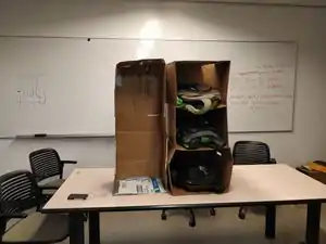 The cubby system includes a total of 32 cubbies which function as individual boxes that can be attached together to form a mass of cubbies. This design considers the desired ease of portability of the cubbies. An individual cubby is 20 inches long, 16 inches wide, and 14 inches and has an absence of a top, which acts as the base for the cubby higher in the column. They also do not have full boarded sides or backs, because they are unnecessary for their function, while reducing cost and weight. The individual cubbies are attached together by velcro on the four posts.